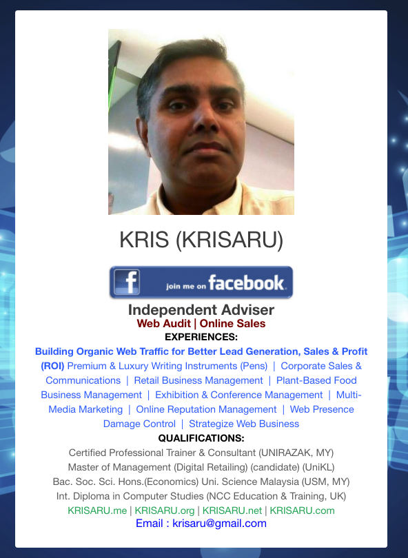 KRISARU continuously strives to address Web Opportunities and Customer Service challenges and his commitment is to ensure that these two areas are given top priority in business. Source: Speaker’s Profile (hkcsc.com)